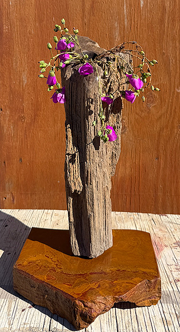 Petrified Vase is an outdoor piece, carved from petrified wood (Texas), with a California (Panamint Valley), onyx base.